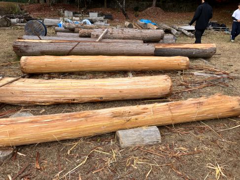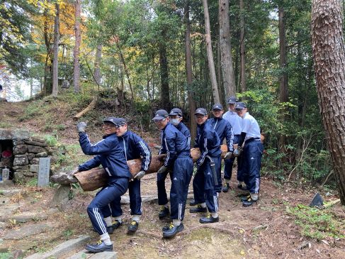 洞樹院で山道の整備、八沢の丘では丸太の皮むき、下山運動場では草むしりを実施しました。