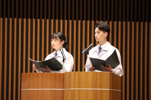 写真左)在校生の言葉 学成会会長 林田來門さん 写真右)式典司会 左側:永坂真衣子さん・右側:桜田矢龍さん