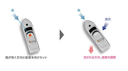- 2. 船首を風向きに向けて方位を保持します。また、流す速度を調節することも可能です。