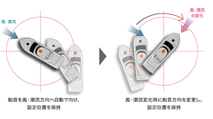 GPSにより船体位置を検出し、コンピューター制御で一定の位置に船体を保持することを可能にしました。船首を風や潮流で流される方向とは逆に向けることで、過度にエンジン回転数を上げることなく、船体を元の位置に戻します。また、風向きや潮流が変わっても、船首を自動的に流される逆方向へ向けながら、船体を元の位置へ戻します。