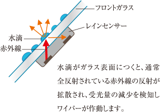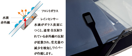 前面ガラスに設置したレインセンサーが、水しぶきや降雨などの水滴量を検知し、ワイパー作動を自動でコントロールすることで、クリアな視界を確保します。また、手動操作も可能です。