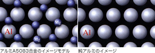 トヨタマリンがアルミハルの素材として使用しているのは、数あるアルミの中でも特に高い強度を誇るA5083(JIS規格 H-4000)。これはアルミに約4.5%のマグネシウムを含んだものです。もともとアルミの表面は酸化皮膜で保護されているため錆に強い性質がありますが、そこにマグネシウムをはじめとする合金成分を混入することで、アルミの耐食性と強度を格段にアップ。船舶はもちろん、新幹線「のぞみ」型車輌や航空機などの溶接構造材料として高い評価を得ています。トヨタマリンのアルミハルは、このアルミA5083合金を使用することで、波からの衝撃や振動、ノイズをいちはやく吸収し、快適なクルージングを実現しています。