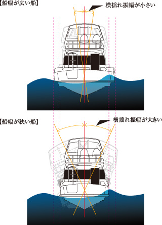 復原力は基本的に、船幅が広いほど、横揺れ周期は短くなります。つまり小刻みな揺れが強くなるということ。ですから、復原力が強すぎてしまっても、横揺れ周期が短くなり、少しの波でもぐらぐらと横揺れしてしまうため、乗り心地もかなりストレスの大きなものとなってしまいます。逆に、復原力が弱いと、横揺れ周期が長くなるため、元に戻るまでの時間が長くなり、転覆するのではないかという不安を感じてしまいます。また、横風を受ければ大きく傾斜し、大きな横波を受ければ転覆する可能性も高くなります。