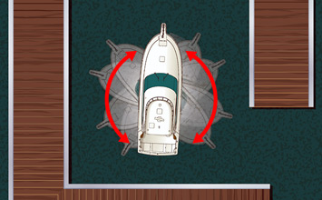 ボートを回転したい方向にジョイスティックのノブを回します。両サイドのプロペラが互いに逆方向に作動することで、艇の中心を軸に360°回転させることが可能です。