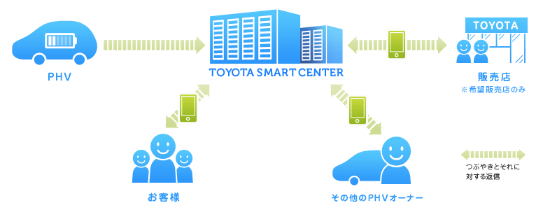 例えば、電池残量が少ない場合、クルマが充電を促す情報を「つぶやき」としてお客様のスマートフォンに発信したり、お客様が希望すれば平均燃費を競ったり、エコ運転の方法などの情報交換を他のお客様と情報交換することもできるようになります。