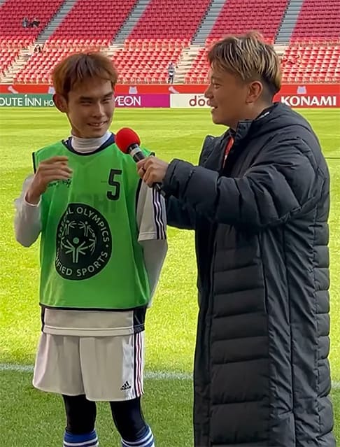 アスリートたちは、日頃Jリーガーたちが使用しているピッチを縦横無尽に走り、堂々としたプレーを披露し、試合は1-1の引き分けとなりました。会場では、スタジアムDJのYO!YO!YOSUKE氏による実況で試合が盛り上がり、ハーフタイムにはアスリートの声の紹介に加え、SON広報プロジェクトアンバサダーのやまだひさし氏も登場し、スペシャルオリンピックスのPRが行われました。