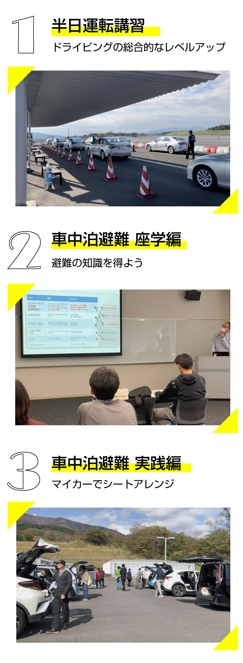 災害時に役立つ車中泊避難についての基礎的な知識と実践が同時に身につきます。