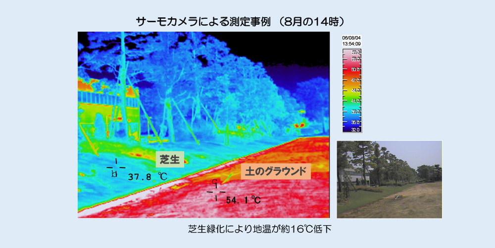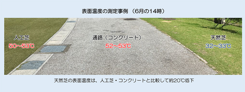 天然芝の場合は、葉の表面から水が蒸発しているため、気温+数度の温度までしか上昇しません。水の蒸発による温度低下は、濡れている洗濯物が冷たいと感じる現象と同様です。表面温度が低いと、照り返しや赤外線の発生が少なく、涼しく感じます。社内の測定事例では、土のグランドと比較して、天然芝の表面温度は、約16℃低下していました。