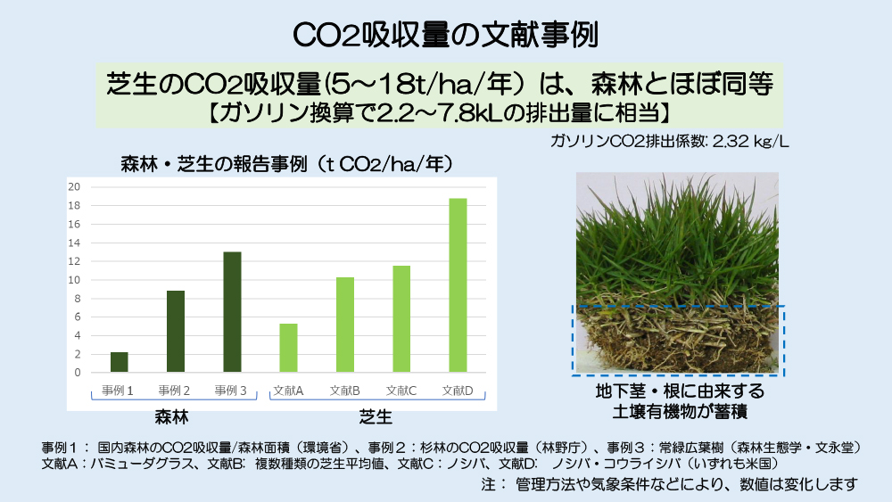 天然芝は、大気中のCO2を吸収しながら成長します。庭の芝生では、茎や根が成長する速度より、分解される速度の方が遅いため、土壌有機物が増加することで、CO2を吸収します。