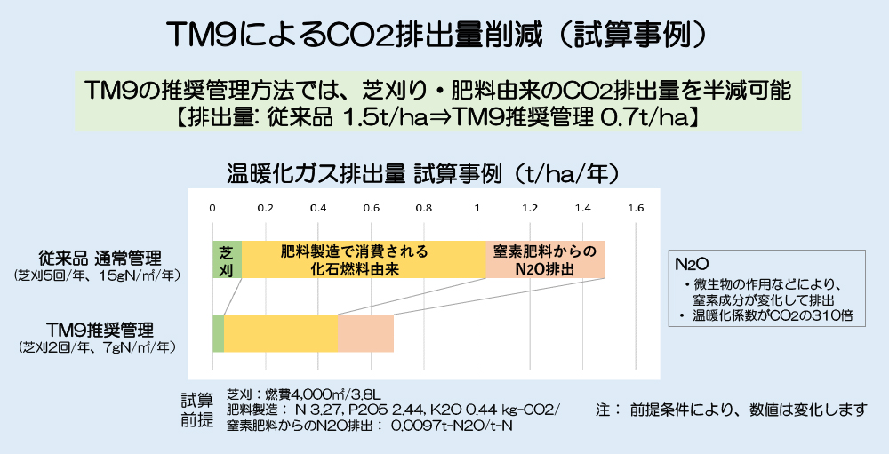 芝生の管理では、肥料由来の地球温暖化ガス(CO2、N2O)が発生しますが、TM9の場合には、使用する肥料の量を半減できるので、温暖化ガスの発生量が半減できます。