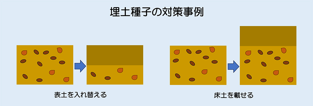 芝生を張る予定の場所に雑草が発生している場合、多数の雑草種子が土壌中に埋まっていることが一般的です(埋土種子)。雑草種子が混ざっている土壌を入れ替えるか、雑草種子の多くは、光が当たる条件で発芽しますので、土壌の上に数cmの床土(雑草種子が入っていない良質な土)でカバーするだけでも、発芽抑制効果が期待できます。