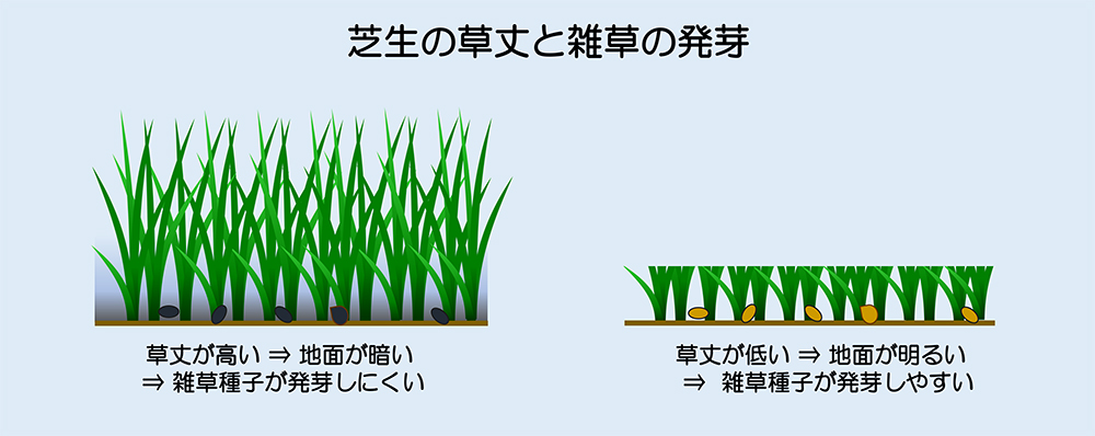 芝生の密度を維持し、芝刈りの高さを3cm以上に調整することで、地表面が暗くなるため、発芽に光が必要な雑草の発生を抑制することができます(芝草研究、2003)。地表に広がるタイプの小型雑草の生育阻害も期待できます。