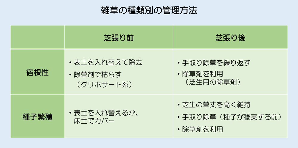 芝生を張る前の土壌に地下茎や球根が残っていると、芝張り後に雑草が再生しますので、芝張り前に、地下茎を含んだ表面の土を、新しい土に入れ替えるか、芝張りの前年に除草剤で完全に枯らします。生きている地下茎や球根が残っている土壌の上に、盛土をしても、多くの場合で再生します。