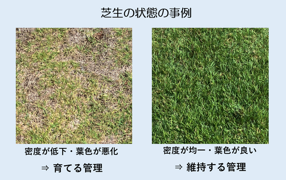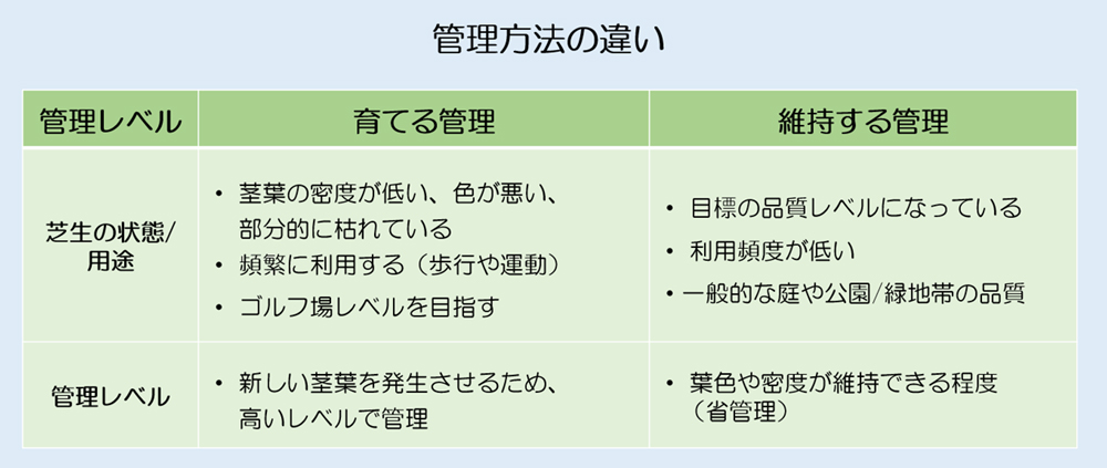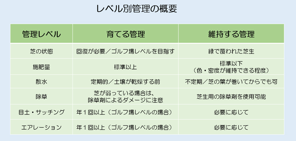 芝生の調子が悪い場合は、育てる管理を行い、目標レベルになったら、維持する管理に移行することで、管理を省力化できます。